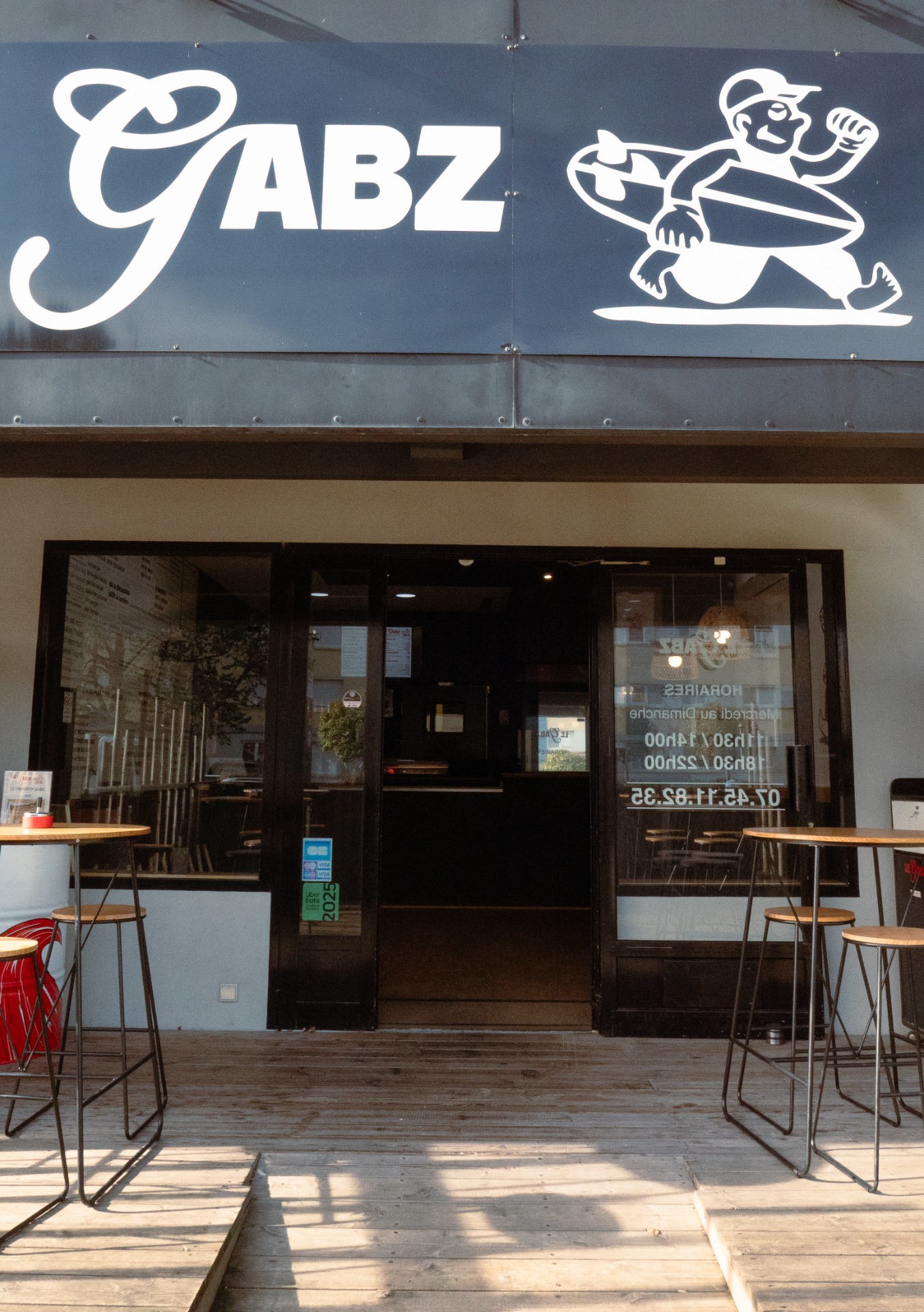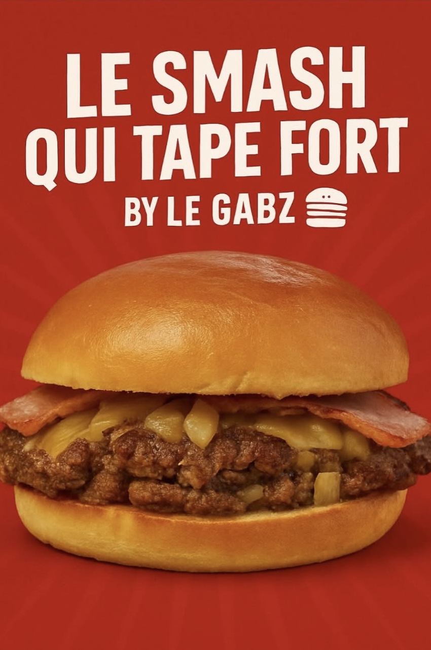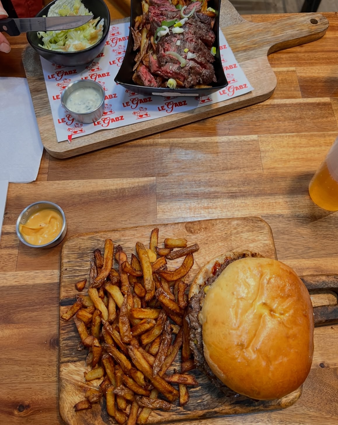 Le GABZ (Pain brioché, Double steak de boeuf du boucher, Cheddar affiné, Poitrine grillée, Confit d'oignon, Sauce au choix) avec frites maison double cuisson